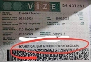 بدأت السفارة التركية في بغداد باصدار نوع جديد من الفيزا للدخول الى الاراضي التركية ، حيث كتب عليها ملاحظة تفيد بان الفيزا غير صالحة لاستخراج الاقامة او اذن العمل في تركيا